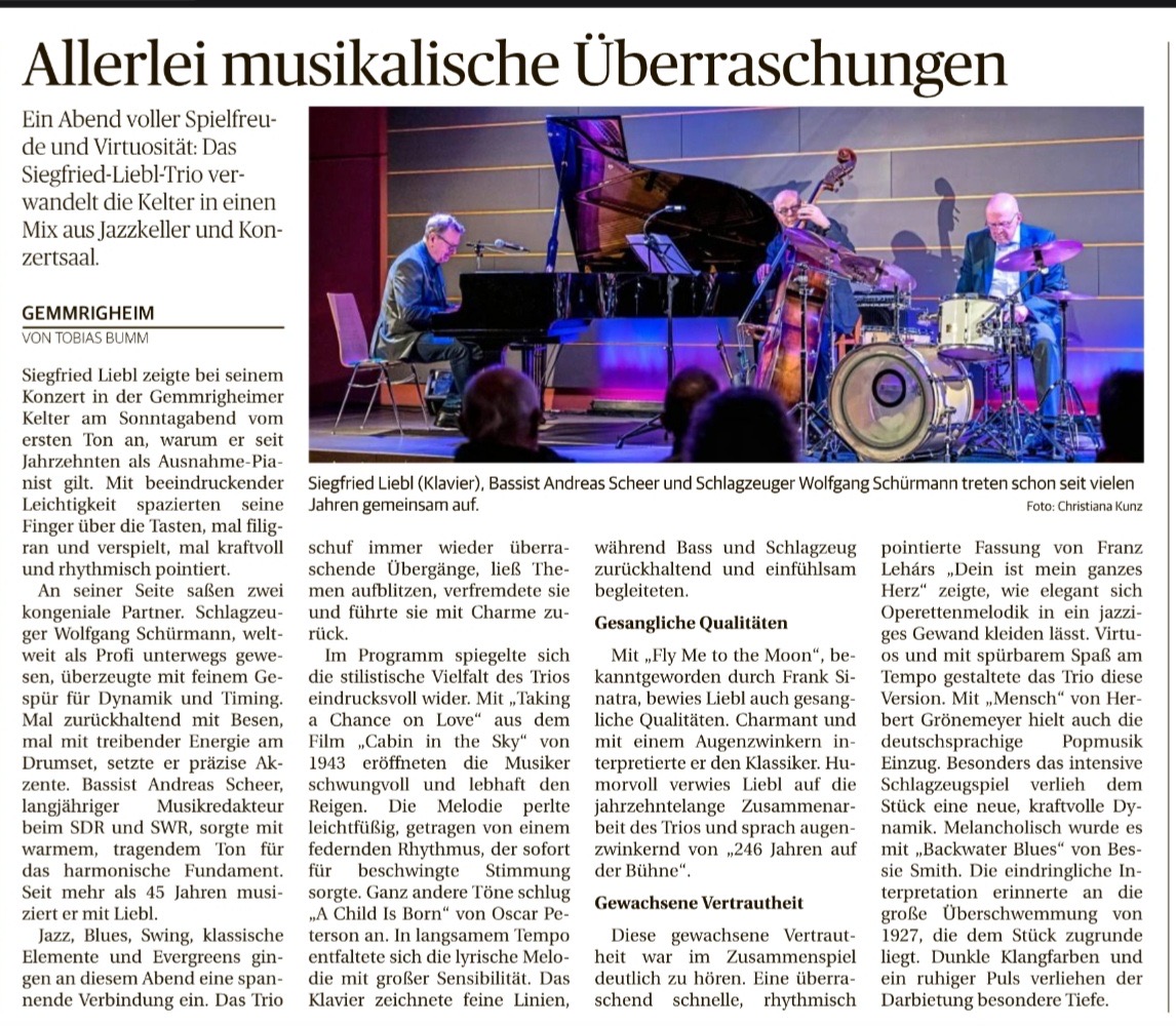 Mit einer wundervollen Mischung aus brillianter Musik und Shortstorries aus dem Leben eines Pianisten haben Siegfried Liebl ( p/voc), Wolfgang Schürmann(d) und Andres Scheer ( b) das Publikum wieder begeistert.